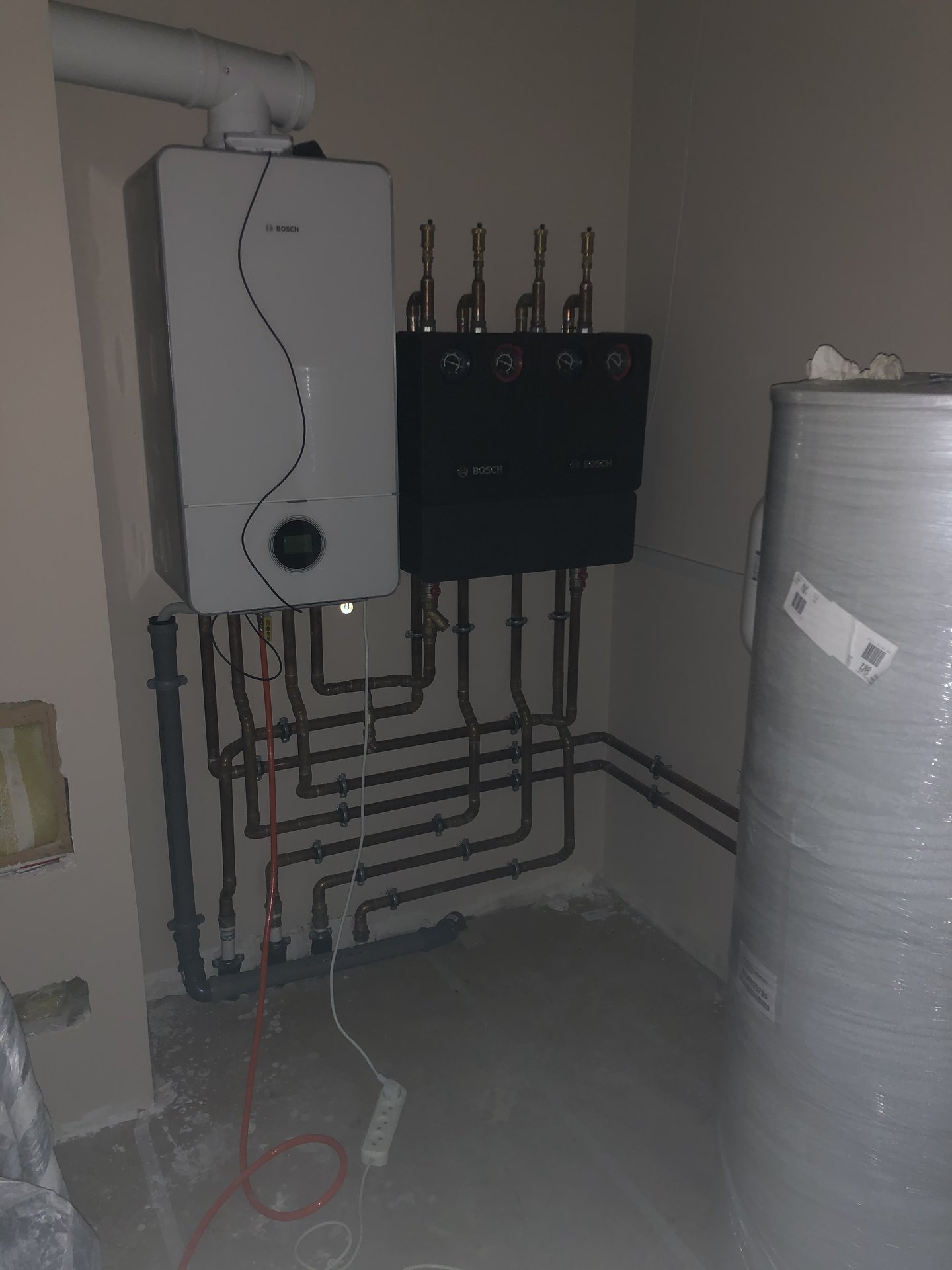 Черные боксы справа от котла - наслсные группы HS25/6 на радиаторы и HSM25/6 на теплый пол. Как я понял, отличаются наличием смесителя у последнего. Под ними коллектор HKV 2/25/25.