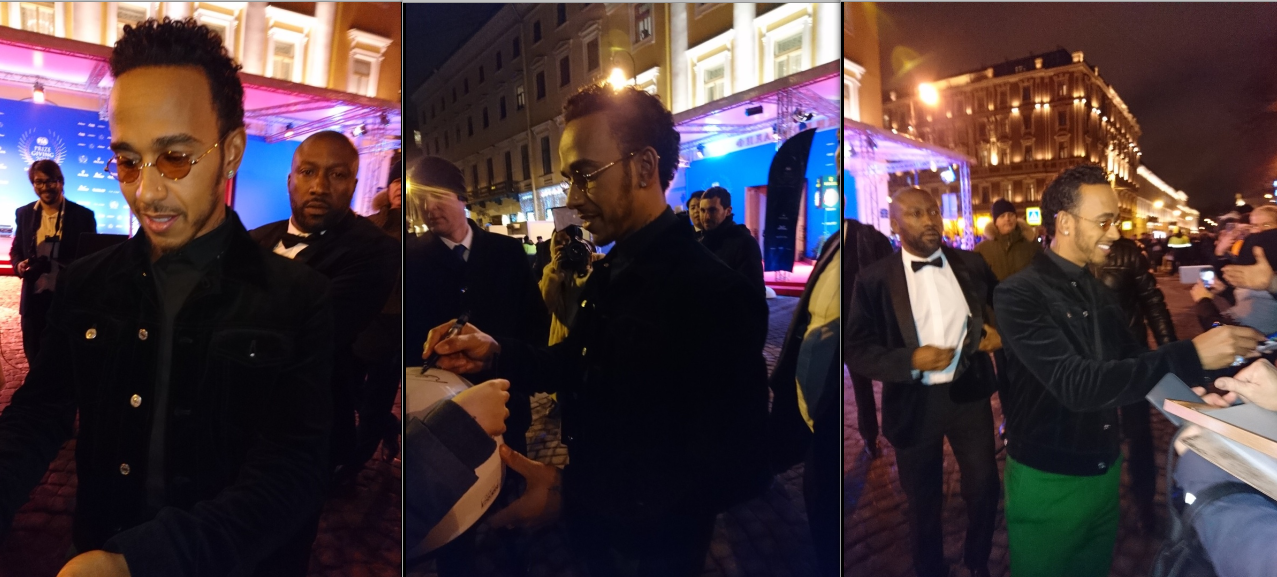 Питерцы говорят,что Хэмилтон был единственным из пилотов кто по приезду, перед входом в театр, раздавал автографы .Кими перед фойе поприветствовал публику а Феттель только из фойе рукой помахал