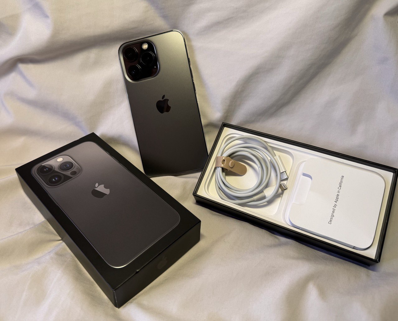 14 Pro Max 256GB, идеальное состояние, на экране стекло, батарея 92%, в подарок новый запечатанный оригинальный силиконовый чехол и пользованный кожаный чехол.